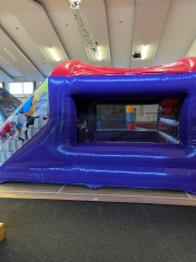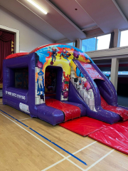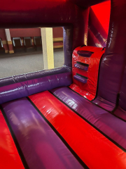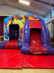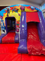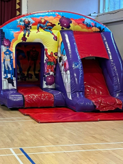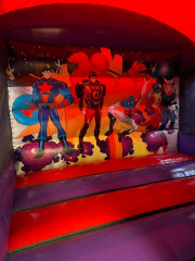 The New Super Hero Castle The new Super Hero Castle has Ladder, Outside Slide, Extra large side window, and is totally covered for all weather. The ultimate castle for every party. 15×18 feet. Perfect for a small garden. Call now for more information.